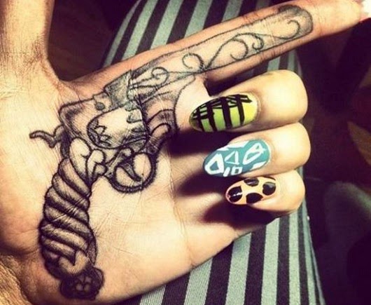 The most common placement for gun tattoos are along the hips, particularly with two pistols holstered at the side, which draws attention to the area which the guns are pointing towards, the genitals, a perfect choice for individual that want their gun tattoos to pertain to their sexuality. Another really cool place for a gun to be inked is on the hands, where the nozzle of the pistol occupies the index and middle finger and the body of the pistol is inked on the hand itself. This placement gives the impression of an actual gun In your hand, ready to fire at whoever gets in your path!